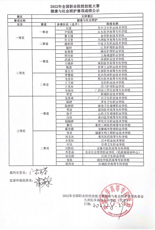 本次賽項于2022826-28日在天津醫(yī)學高等專科學校舉行,吸引了來自全國28個省、自治區(qū)、直轄市的60個院校、60支代表隊的選手和指導老師參賽。全國職業(yè)院校技能大賽高職組健康與社會照護賽項共分為兩個賽道,每個賽道設(shè)個人一、二、三等獎,獲獎比例分別為 10%、20%、30%,獲得一等獎參賽選手的指導教師將由大賽組委會頒發(fā)優(yōu)秀指導教師證書。