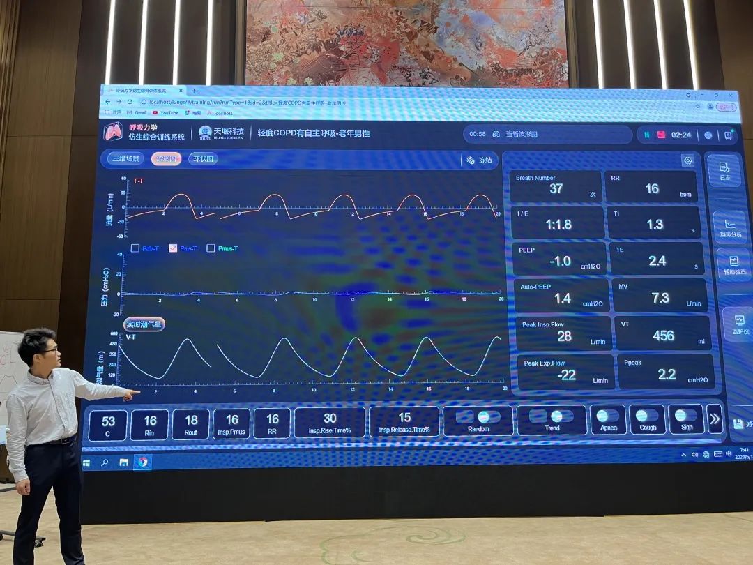 此外,來自中國科學技術大學附屬第一醫(yī)院(安徽省立醫(yī)院)的金魁主任在講授主旨為“異常波形分析”的論壇講座時,使用了天堰科技“模擬肺”內(nèi)置的呼吸力學模型——“輕度COPD有自主呼吸 老年男性”,幫助參會學員更好的理解存在肺部疾病患者機械通氣時通氣波形的特點及監(jiān)測參數(shù)異常改變。金魁主任對“模擬肺”給予了高度肯定,并建議學員課后有時間都可以進行實操訓練。